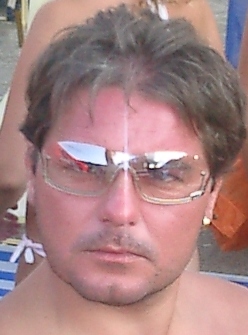 Un minuto di silenzio...ssshh...ecco a voi il RE incontrastato di tutta l'Isola...senza alcnua ombra di dubbio! Avete visto le foto? Chi oserebbe presentarsi in spiaggia, poi danzante su un tavolo, poi a donne con una fasciatura che va dalla caviglia al pene? Qusta vacanza l'ha distrutto fisicamente: un incidente in motorino, le labbra alla Valeria Marini, le caviglie alla Nadia Rinaldi, i piedi rovinati dalle Nedved, dalla Pitoné, ma soprattutto dalle Blacks (le sue scarpe). Ma il suo sguardo...il suo sguardo era troppo determinato (non guardate la foto a destra, please): Voleva essere il protagonista a tutti i costi e ci è riuscito. Mitico il Super-Zazzi Show: mantello sulle spalle e pipì sul tavolo davanti a tutti. Uno dei pochi che avuto il coraggio di fare il confronto con sasà. Ma ne è uscito vinictore lui...parola dello stesso sasà: "sei un grande, se vieni in consolle con me le distruggiamo tutte". Lui è restato con noi umile...nel tavolo esterno...Un gladiatore...Un Dio. VOTO:10 con Lode |